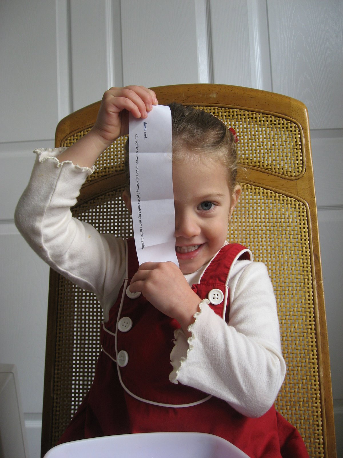 I know I said that I would do the Silver Bella giveaway drawing on Thursday, but time & sunlight got away from me (man, I hate this getting dark at 4:30 nonsense!) so it got postponed to this morning. I printed out & cut up everybody's comments and put them in the ol' Goblet of Fire, and had my trusty assistant draw the winning name: