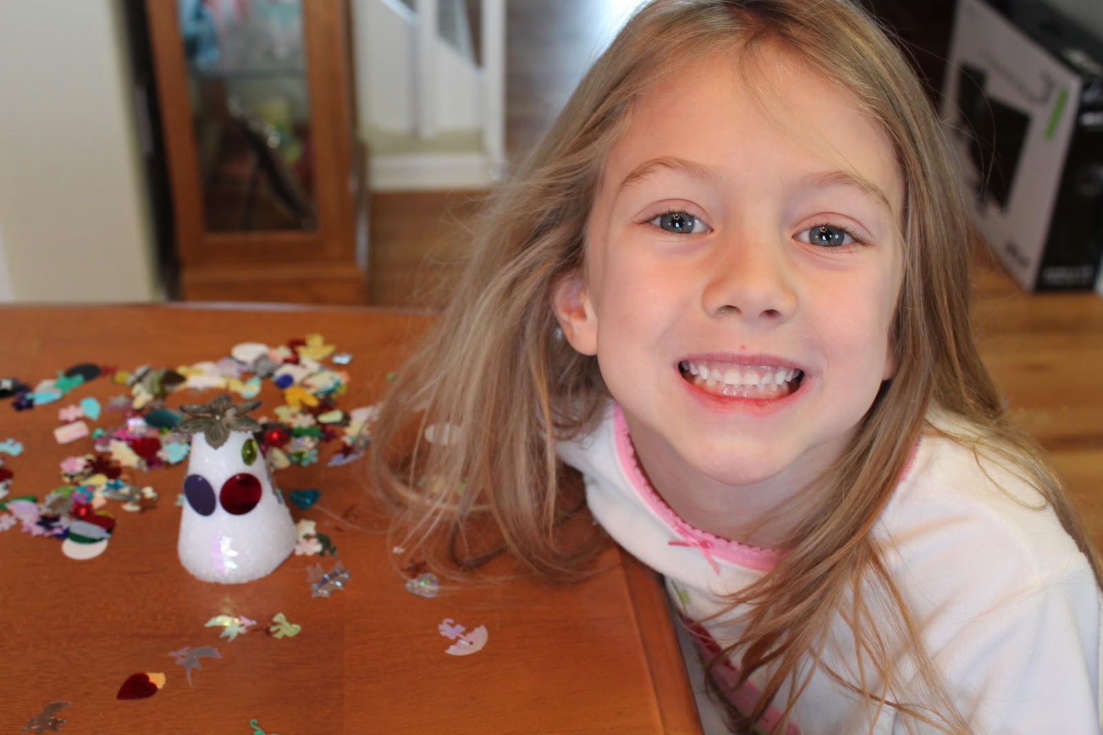 Part of the problem was that I didn't love the mix of sequins that I bought, because many of them were in strange shapes like baby bottles and bibles and were really more like confetti because they didn't even have holes. If I were to do this again, I'd just purchase the big multipack of round sequins in various sizes and colors instead. I actually had a few styrofoam balls kicking around that I thought I would use when the cones were gone but I never made it to those--we didn't even use all of the cones before we lost interest.