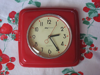 I didn't think to take a photo of the "donor" clock, but just imagine your garden-variety plastic, few bucks at Wal-Mart type of clock. I used a butter knife to pop off the plastic dome, unscrewed the hands and removed the little black box. Threaded it through the hole on the red clock, reattached the hands and the glass dome and hurrah--it worked! I did have to fiddle with the hands a bit to make sure they were seated correctly but it's keeping time like a champ now.